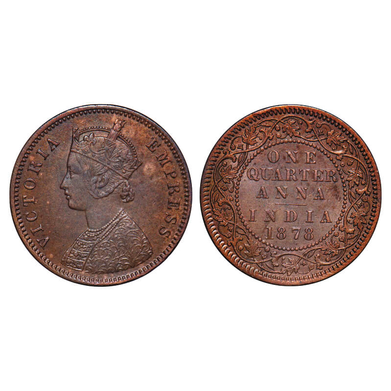 Victoria Empress, Copper, Quarter Anna, 1878, Calcutta Mint, B/II, No mint mark, die crack on Rev. F. Prid 612. GK 830. About Uncirculated. Rare.