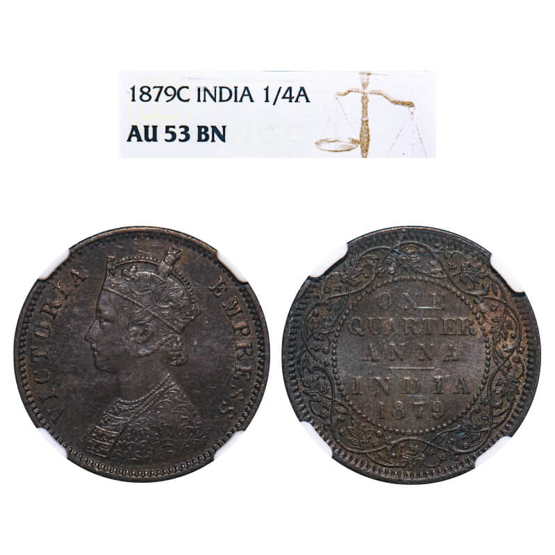 Victoria Empress, Copper, Quarter Anna, 1879, Calcutta Mint, B/II, 'C' incused. F. Prid 613. GK 831. NGC Slabbed AU 53 BN. Very Rare.