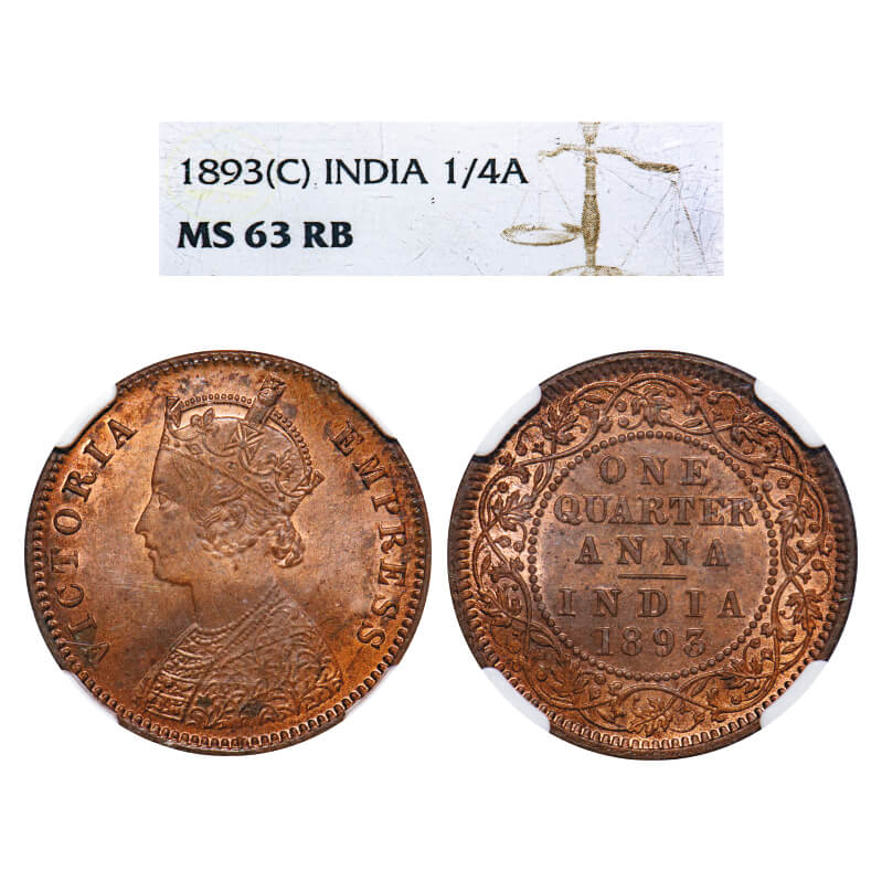 Victoria Empress, Copper, Quarter Anna, 1893, Calcutta Mint, B/II, No mint mark. F. Prid 626. GK 852. NGC Slabbed MS 63. Rare.