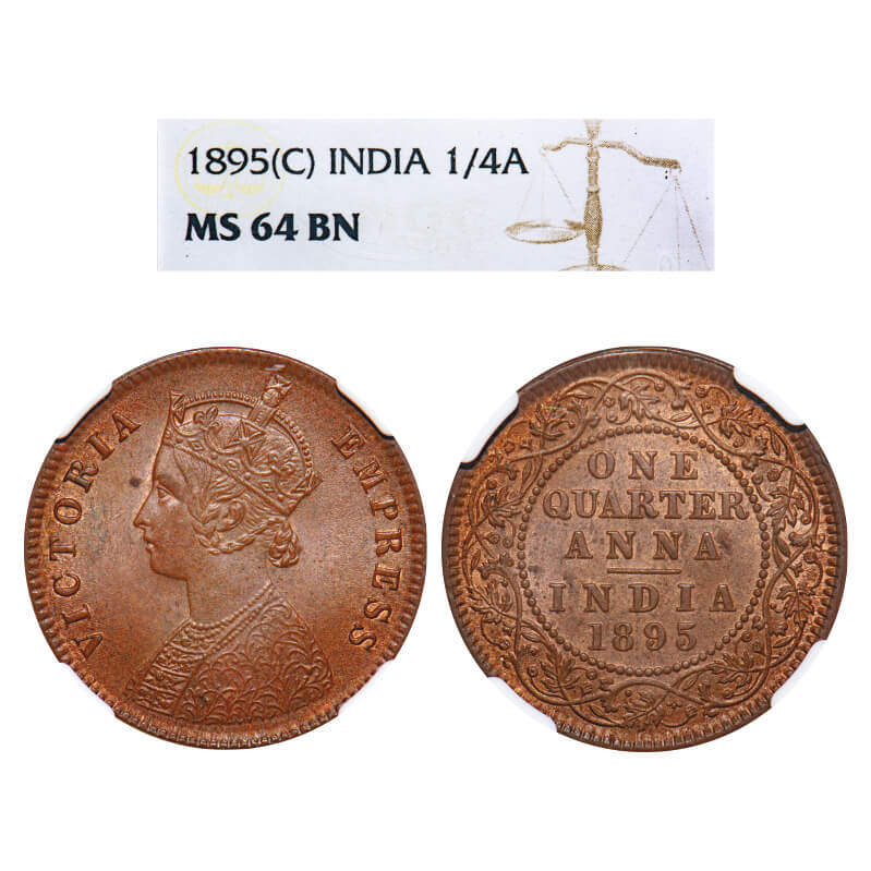 Victoria Empress, Copper, Quarter Anna, 1895, Calcutta Mint, B/II, No mint mark. F. Prid 628. GK 854. NGC Slabbed MS 64 BN. Exceedingly Rare.