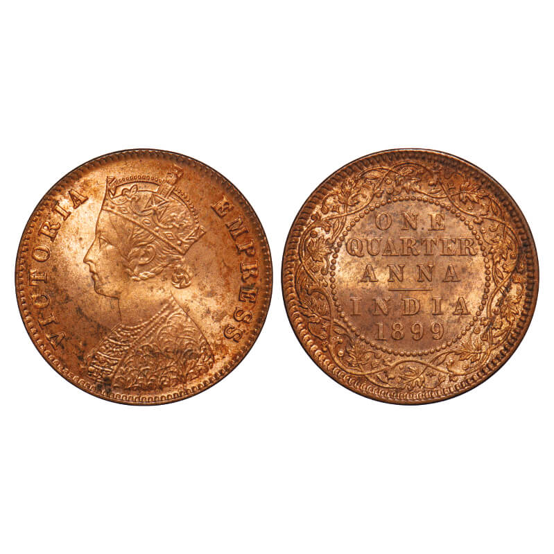 Victoria Empress, Copper, Quarter Anna, 1899, Calcutta Mint, B/II, No mint mark. F. Prid 632. GK 858. Uncirculated. Very Scarce.