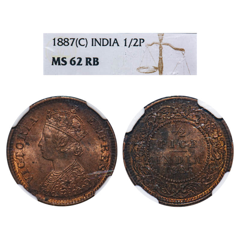 Victoria Empress, Copper, 1/2 Pice, 1887, Calcutta Mint, A/I, No mint mark. F. Prid 719. GK 867. NGC Slabbed MS 62 RB. Rare.
