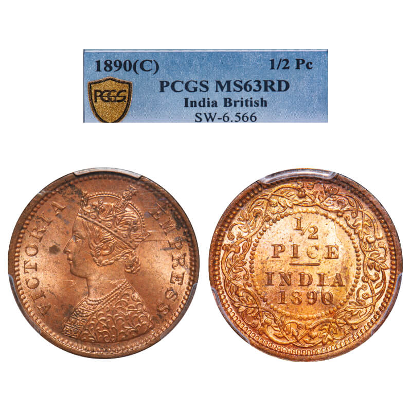 Victoria Empress, Copper, 1/2 Pice, 1890, Calcutta Mint, A/I, No mint mark. F. Prid 722. GK 870. PCGS Slabbed MS 63 RD. Very Rare.