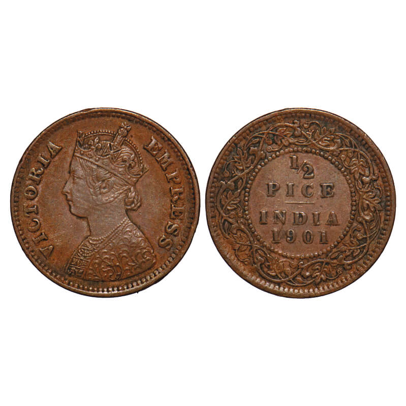 Victoria Empress, Copper, 1/2 Pice, 1901, Calcutta Mint, A/I, No mint mark. F. Prid 734. GK 881. Extremely Fine. Scarce.