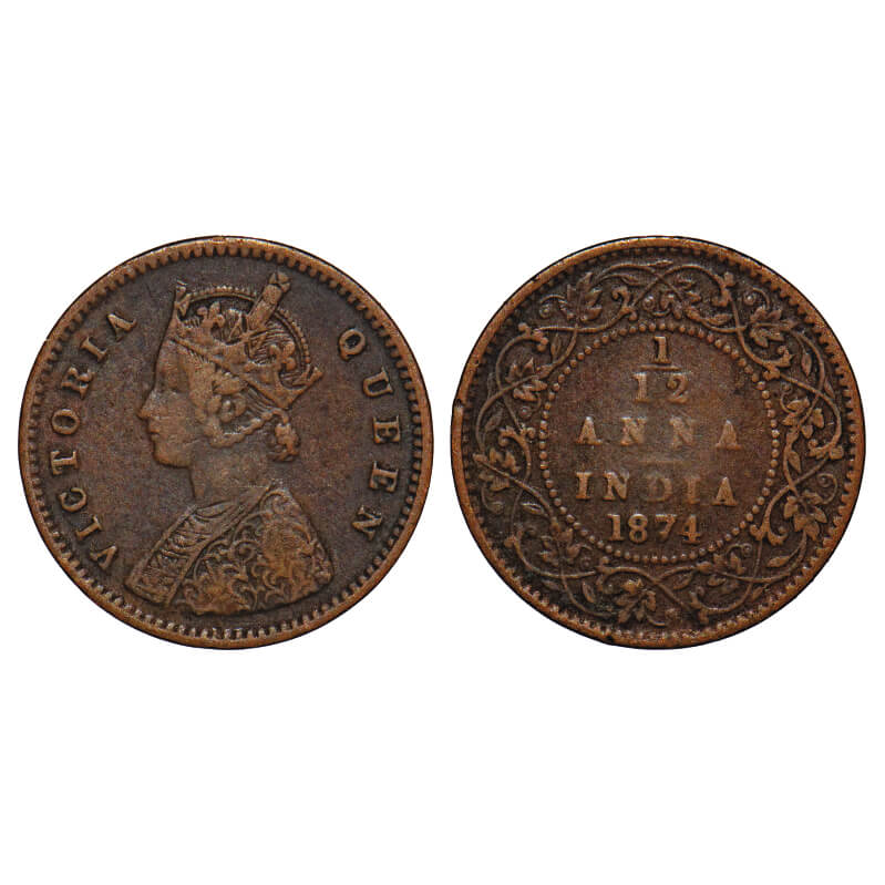 Victoria Queen, Copper, 1/12 Anna, 1874, Calcutta Mint, No mint mark, Obv A. F. Prid 783. GK 882. Very Fine+. Rare.
