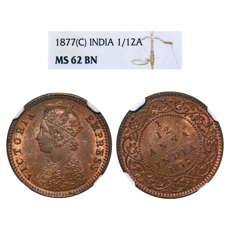 Victoria Empress, Copper, 1/12 Anna, 1877, Calcutta Mint, Obv B, No mint mark, Almost 11'o clock on Rev not mentioned on the slab. F. Prid 786. GK 890. NGC MS 62 BN. Extremly Rare.