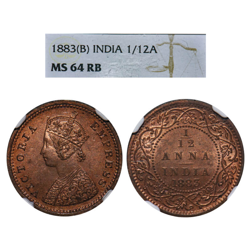 Victoria Empress, Copper, 1/12 Anna, 1883, Bombay Mint, No mint mark, Obv A. F. Prid 811. GK 895. NGC Slabbed MS 64 RB. Extremely Rare.