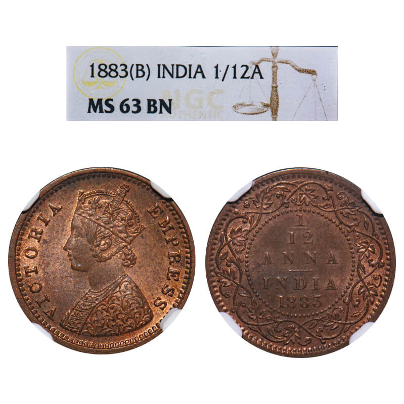 Victoria Empress, Copper, 1/12 Anna, 1883, Bombay Mint, No mint mark, Obv A. F. Prid 811. GK 895. NGC Slabbed MS 63 BN. Very Rare.
