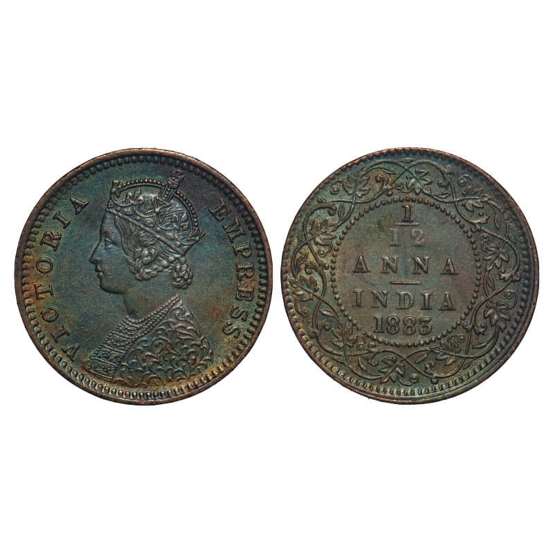 Victoria Empress, Copper, 1/12 Anna, 1883, Calcutta Mint, Obv B, 'C' incused. F. Prid 789. GK 896. About Uncirculated, Toned. Rare.