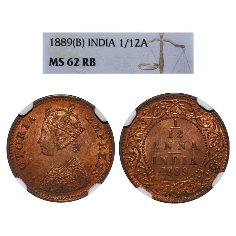 Victoria Empress, Copper, 1/12 Anna, 1889, Bombay Mint, No mint mark, Obv A. F. Prid 816. GK 909. NGC Slabbed MS 62 RB. Very Rare.
