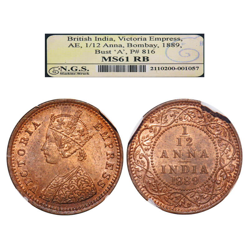 Victoria Empress, Copper, 1/12 Anna 1889, Bombay Mint, Obv A, No mint mark. F. Prid 816. GK 909. NGS Slabbed MS 61 RB. Rare.