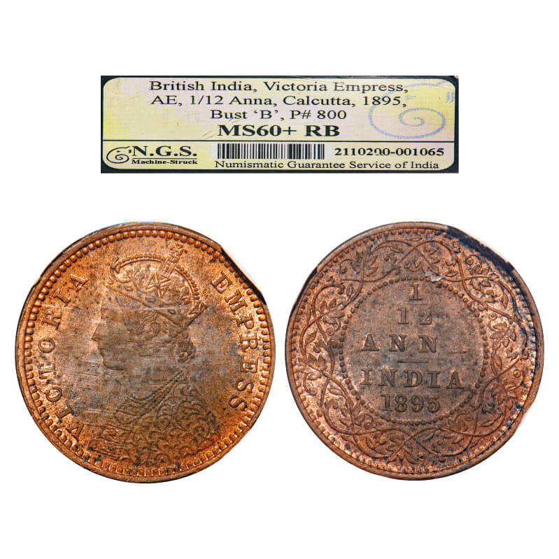 Victoria Empress, Copper, 1/12 Anna 1895, Calcutta Mint, Obv B, No mint mark. F. Prid 800. GK 916. NGS Slabbed MS 60+ RB. Very Scarce.
