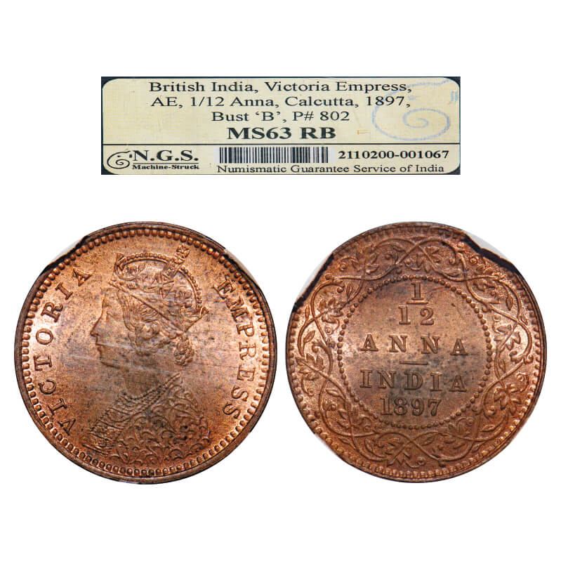 Victoria Empress, Copper, 1/12 Anna 1897, Calcutta Mint, Obv B, No mint mark. F. Prid 802. GK 918. NGS Slabbed MS 63 RB. Rare.