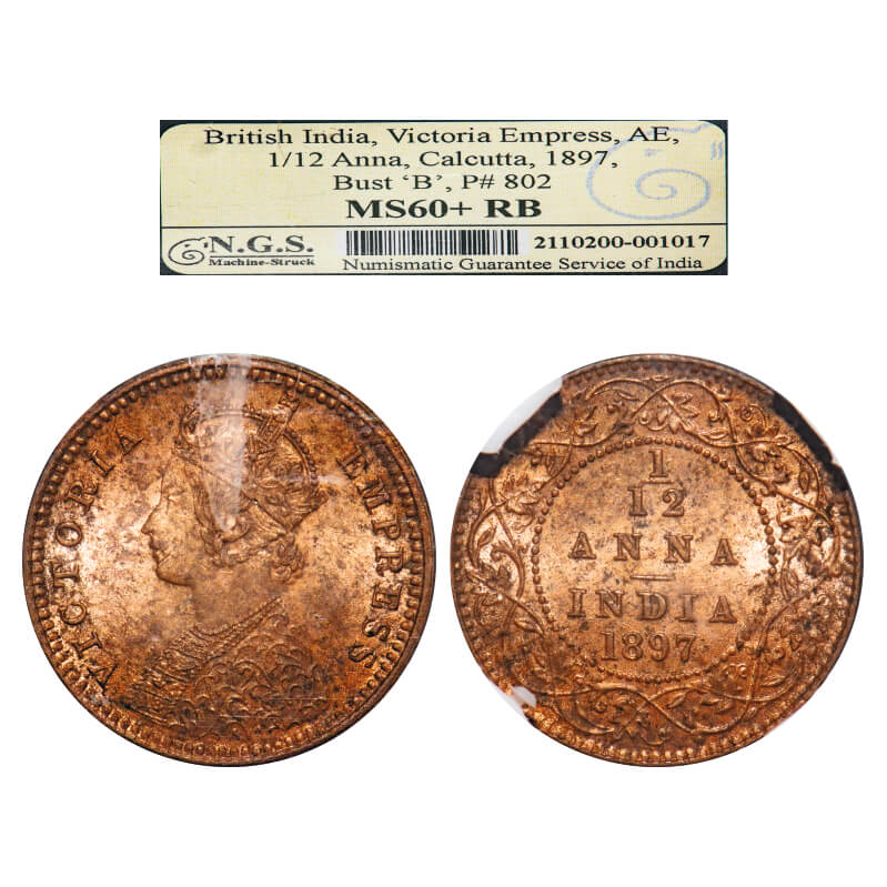 Victoria Empress, Copper, 1/12 Anna 1897, Calcutta Mint, Obv B, No mint mark. F. Prid 802. GK 918. NGS Slabbed MS 60+ RB. Very Scarce.