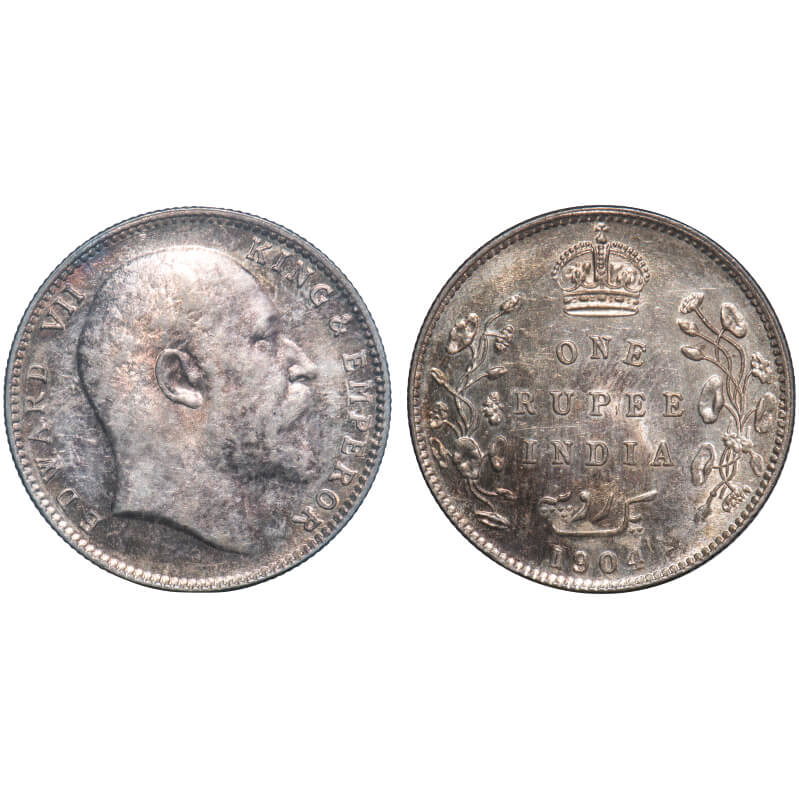 Edward VII, Silver, Rupee, 1904, Bombay Mint, 'B' incused and dot, 5 Diamonds and bottom stroke of numeral 4 short. F. Prid 200. GK 932. Brilliant Uncirculated. Rare.