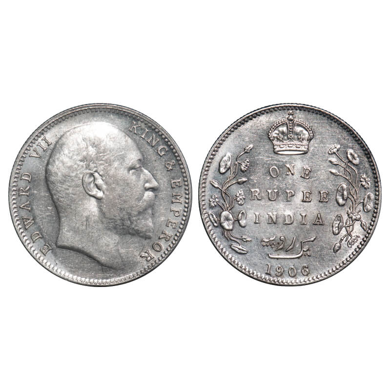 Edward VII, Silver, Rupee, 1906, Bombay Mint, B incused and dot. F. Prid 202. GK 940. Uncirculated with luster. Very Scarce.