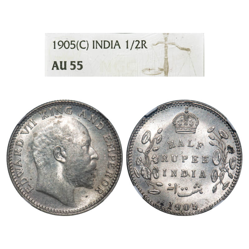Edward VII, Silver, Half Rupee, 1905, Calcutta Mint, No mint mark. F. Prid Unlisted. GK 960. NGC Slabbed AU 55. Very Rare.