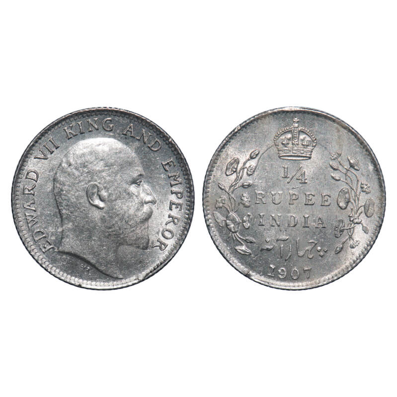 Edward VII, Silver, 1/4 Rupee, 1907, Calcutta Mint, No mint mark, Ghost on rev, Die crack on Rev. F. Prid 436. GK 976. Uncirculated. Very Scarce.