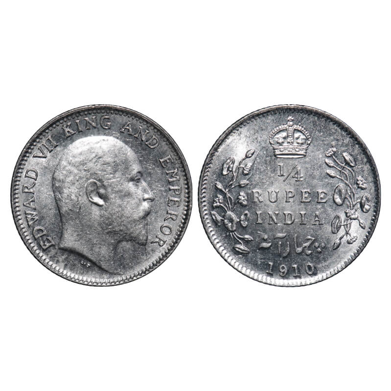Edward VII, Silver, 1/4 Rupee, 1910, Calcutta Mint, No mint mark. F. Prid 439. GK 978. Brilliant Uncirculated. Rare.