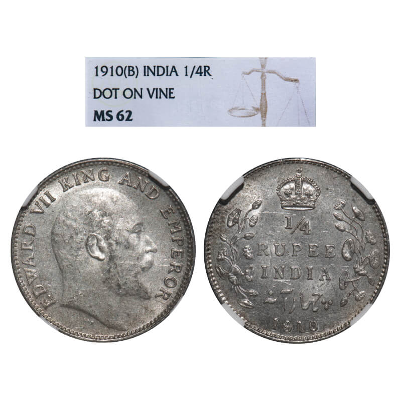 Edward VII, Silver, 1/4 Rupee, 1910, Bombay Mint, Dot, Dot on vain defined on the slab. F. Prid Unlisted. GK 979. NGC Slabbed MS 62. Very Rare.