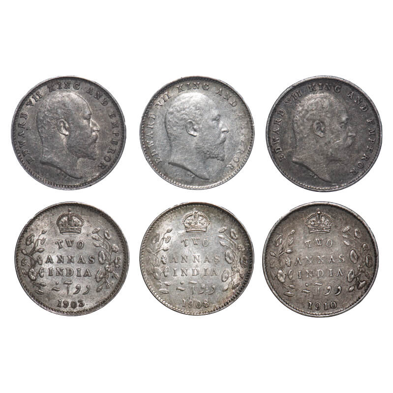| Edward VII, Silver, 2 Annas, (3 coins), 1) 1903, Calcutta Mint, No mint mark, Die crack on Obv, 2) 1908, Calcutta Mint, No mint mark, Ghost on Rev, 3) 1910, Bombay Mint, Dot. F. Prid 556, 561, Unlisted. GK 980, 985, 988. Extremely Fine to Extremely Fine+. Scarce. |