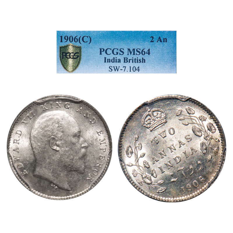 Edward VII, Silver, 2 Annas, 1906, Calcutta Mint, No mint mark, Almost 11'o clock on Rev. F. Prid 559. GK 983. PCGS Slabbed MS 64. Very Rare.