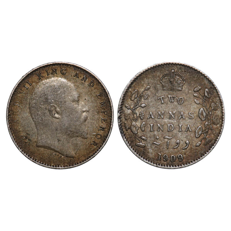 Edward VII, Silver, 2 Annas, 1909, Calcutta Mint, No mint mark. F. Prid 562. GK 986. Extremely Fine+. Rare.