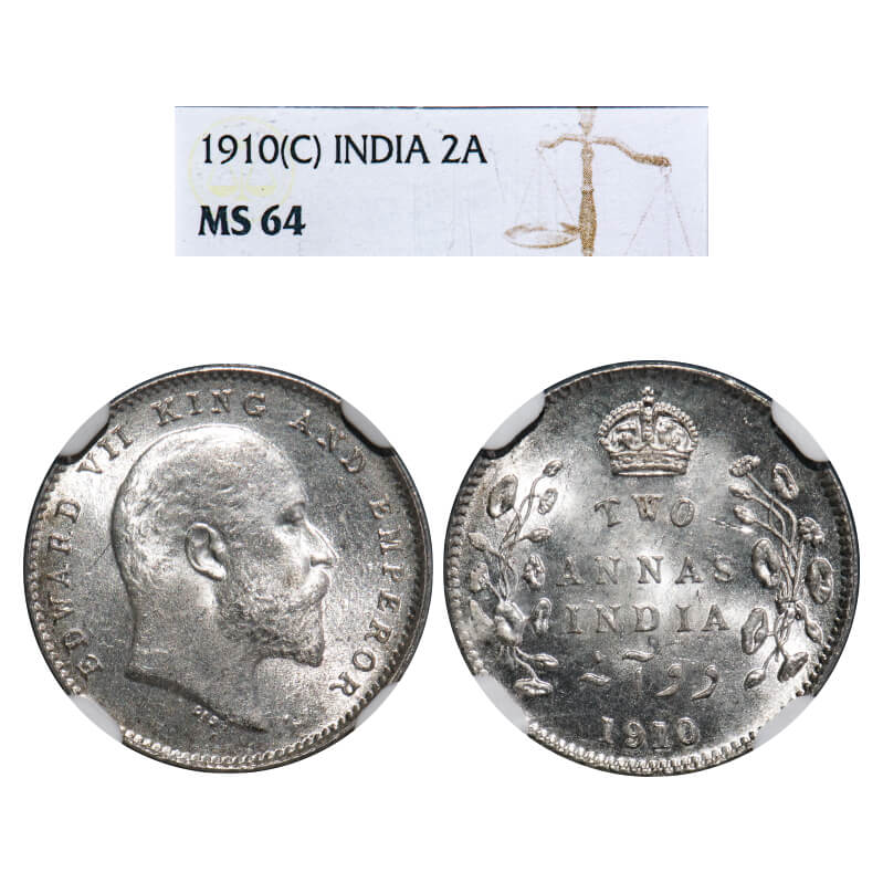 Edward VII, Silver, 2 Annas, 1910, Calcutta Mint, No mint mark. F. Prid 563. GK 987. NGC Slabbed MS 64. Very Rare.