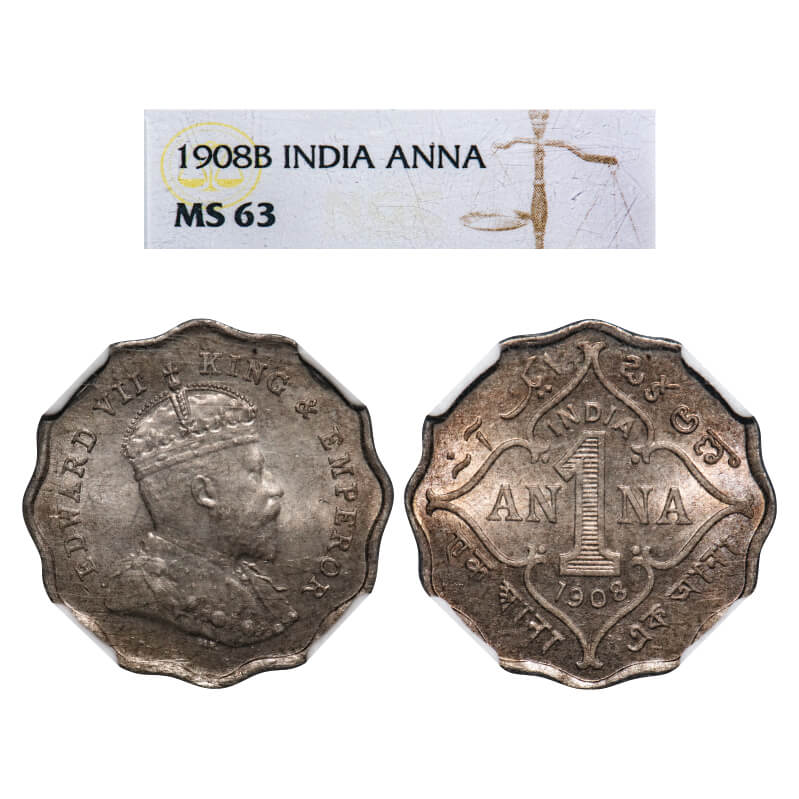 Edward VII, Copper-Nickel, 1 Anna, 1908, Bombay Mint, 'B' incused. F. Prid 927. GK 991. NGC Slabbed MS 63. Very Rare.