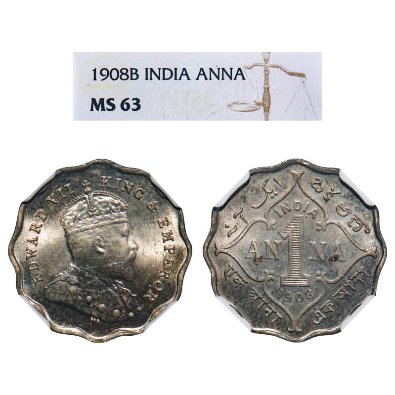 Edward VII, Copper-Nickel, 1 Anna, 1908, Bombay Mint, 'B' incused. F. Prid 927. GK 991. NGC Slabbed MS 63. Very Rare.