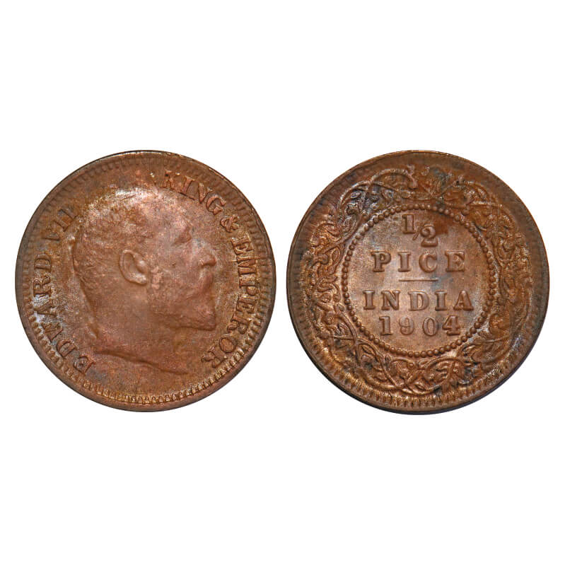 | Edward VII, Copper, 1/2 Pice, 1904, Calcutta Mint, No mint mark, Die cracks on Obv, Variety, Thick numeral 4 in year date 1904. F. Prid 736. GK 1004. Uncirculated. Very Rare. |