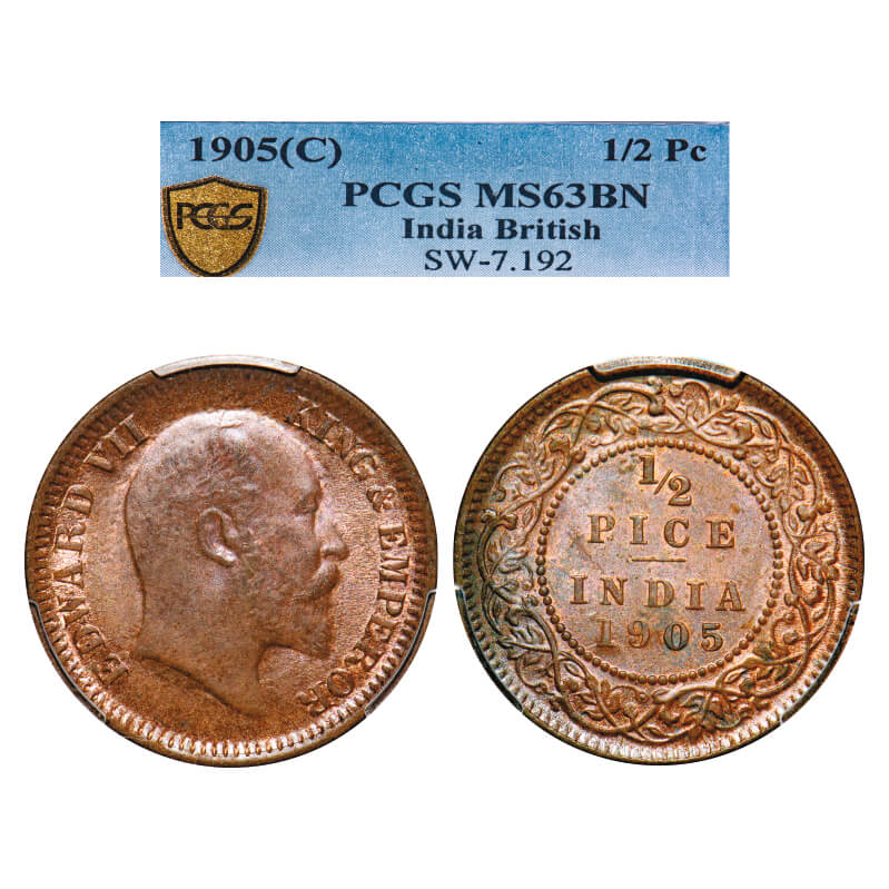 Edward VII, Copper, 1/2 Pice, 1905, Calcutta Mint, No mint mark. F. Prid 738. GK 1005. PCGS Slabbed MS 63 BN. Rare