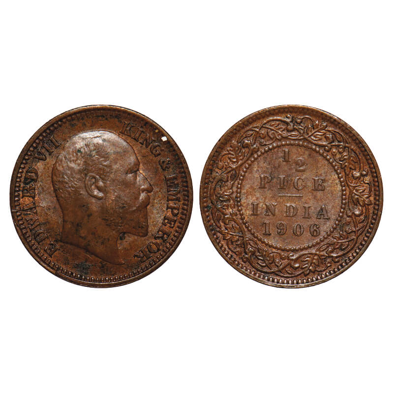 Edward VII, Copper, 1/2 Pice, 1906, 3.24 gm, Calcutta Mint, No mint mark. F. Prid 739. GK 1006. Extremely Fine. Scarce.
