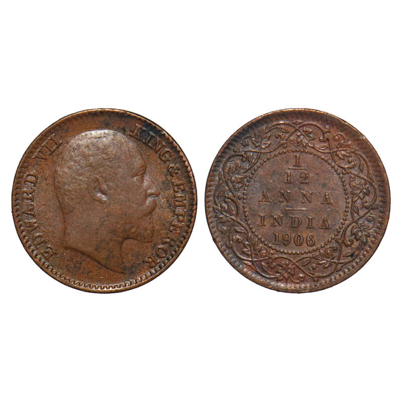 Edward VII, Bronze, 1/12 Anna, 1906, 1.99 gm, Calcutta Mint, No mint mark. F. Prid 822. GK 1016. Extremely Fine+. Scarce.