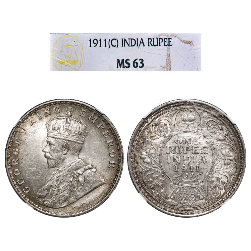 George V, Silver, Rupee, 1911, Calcutta Mint, No dot, Pig-Type. F. Prid 207. GK 1021. NGC Slabbed MS 63. Extremely Rare.
