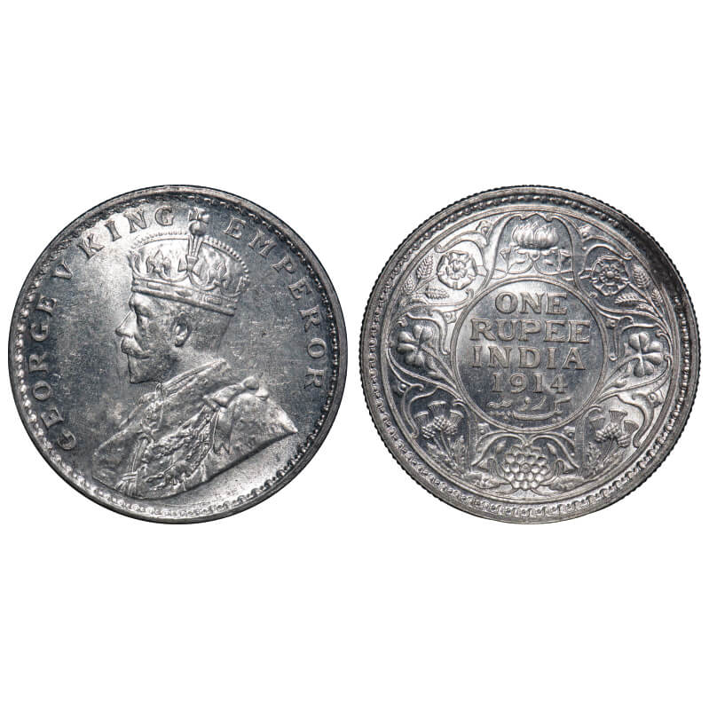 George V, Silver, Rupee, 1914, Calcutta Mint, No dot. F. Prid 210. GK 1029. Uncirculated, Details. Rare.