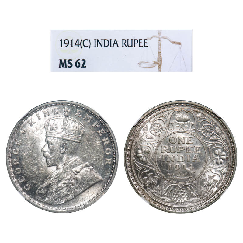 George V, Silver, Rupee, 1914, Calcutta Mint, No dot. F. Prid 210. GK 1029. NGC Slabbed MS 62. Very Rare.