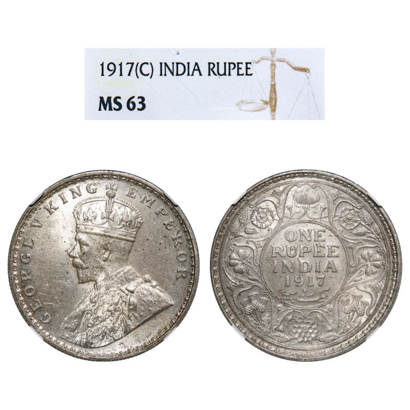 George V, Silver, Rupee, 1917, Calcutta Mint, No dot. F. Prid 213. GK 1035. NGC Slabbed MS 63. Very Rare.