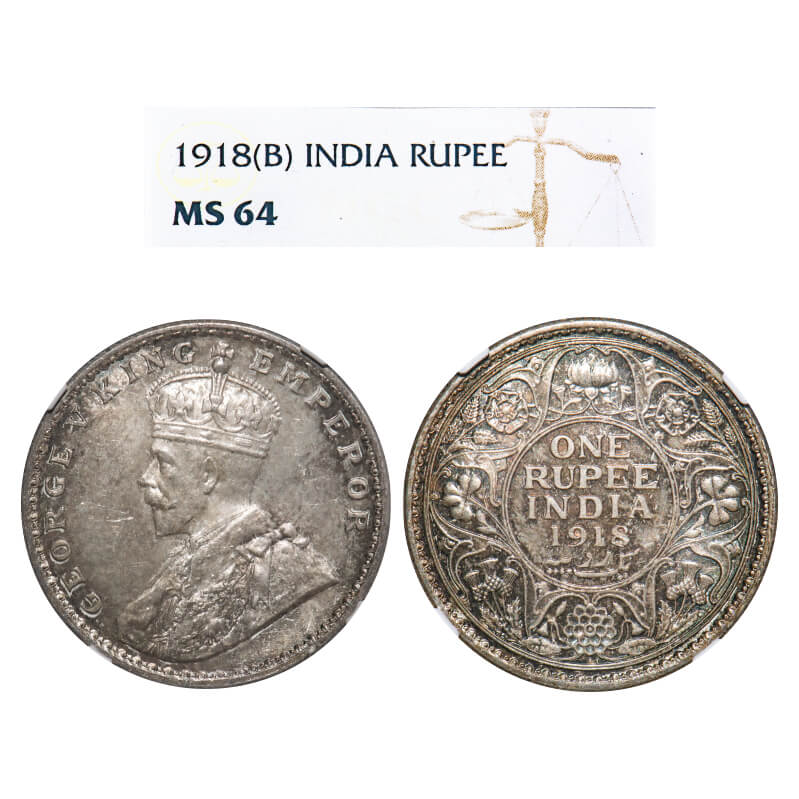 George V, Silver, Rupee, 1918, Bombay Mint, Dot. F. Prid 224. GK 1038. NGC Slabbed MS 64, (Rainbow Toned). Very Rare.