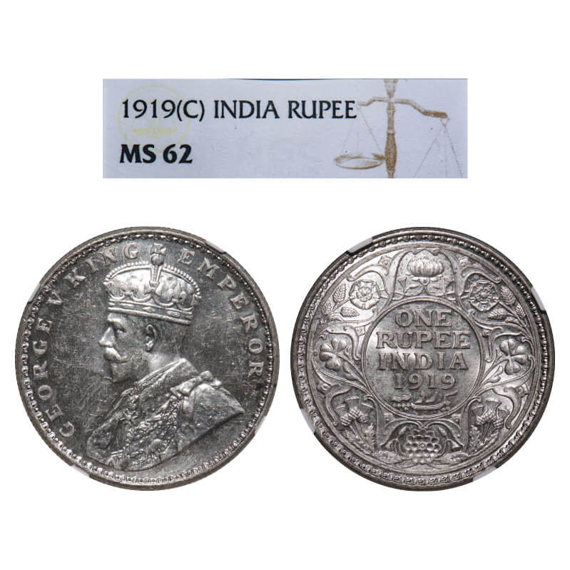 George V, Silver, Rupee, 1919, Calcutta Mint, No dot. F. Prid 215. GK 1039. NGC Slabbed MS 62. Rare.