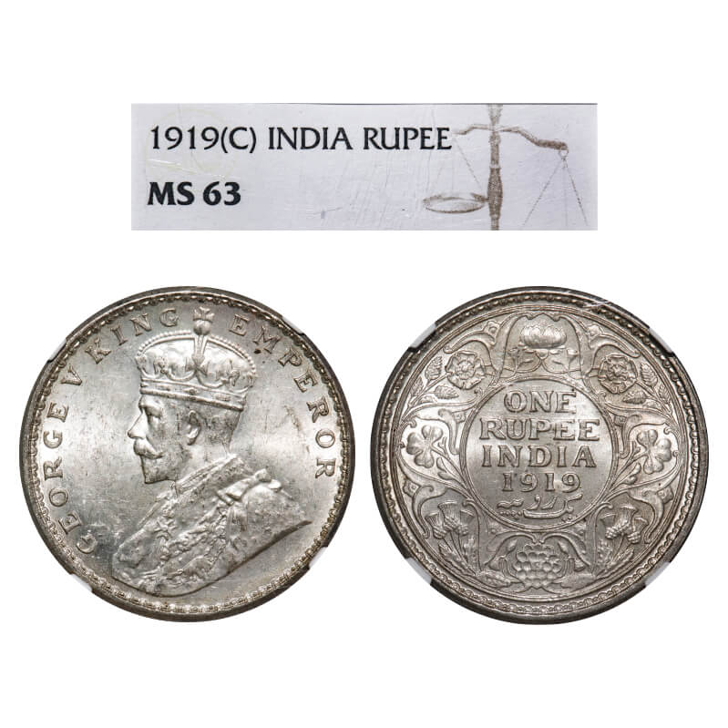 George V, Silver, Rupee, 1919, Calcutta Mint, No dot. F. Prid 215. GK 1039. NGC Slabbed MS 63. Rare.