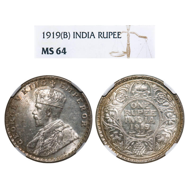 George V, Silver, Rupee, 1919, Bombay Mint, Dot. F. Prid 225. GK 1040. NGC Slabbed MS 64. Very Rare.