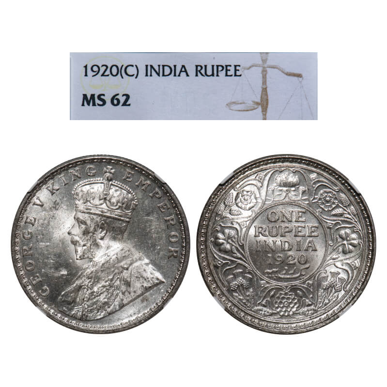 George V, Silver, Rupee, 1920, Calcutta Mint, No dot. F. Prid 216. GK 1041. NGC Slabbed MS 62. Rare.
