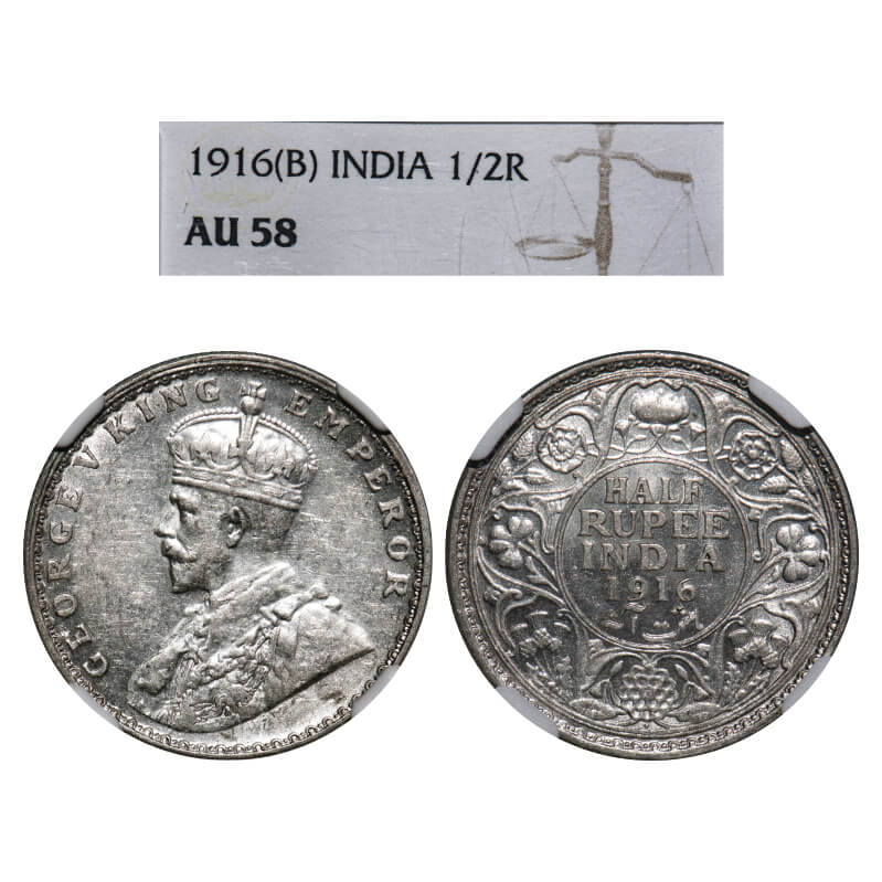 George V, Silver, Half Rupee, 1916, Bombay Mint, Dot. F. Prid 340. GK 1054. NGC Slabbed AU 58. Rare.