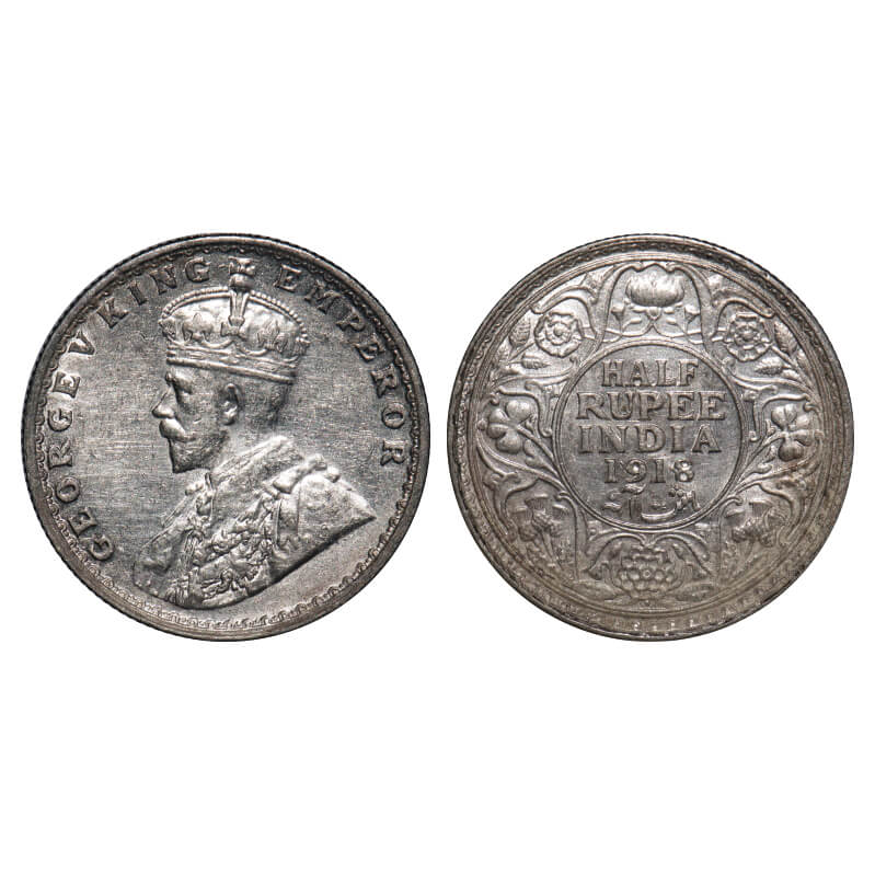 George V, Silver, Half Rupee, 1918, Bombay Mint, Dot. F. Prid 342. GK 1056. About Uncirculated. Very Scarce.