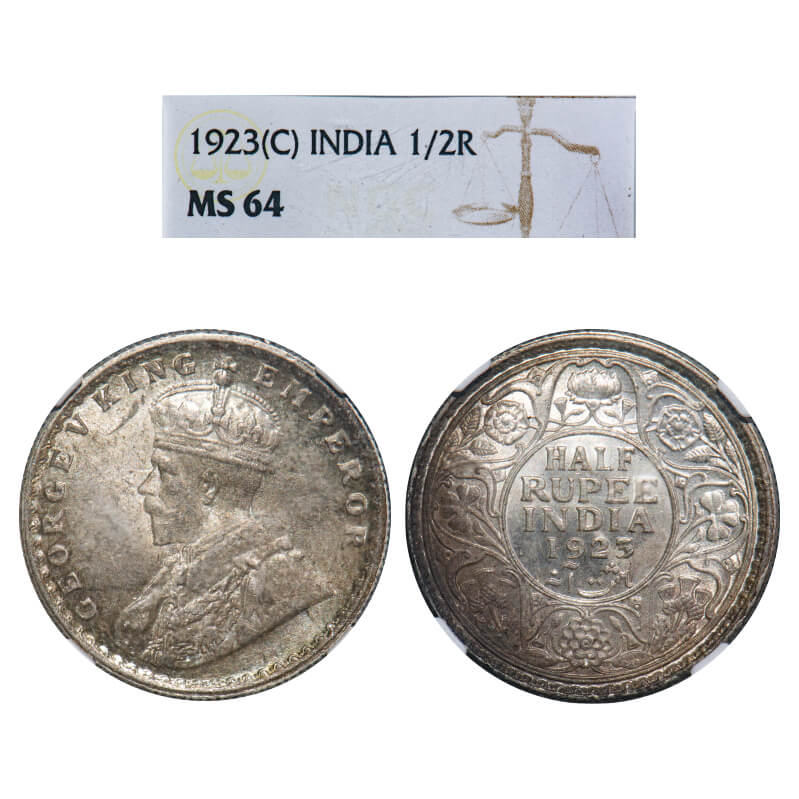 George V, Silver, Half Rupee, 1923, Calcutta Mint, No dot. F. Prid 326. GK 1061. NGC Slabbed MS 64. Extremely Rare.
