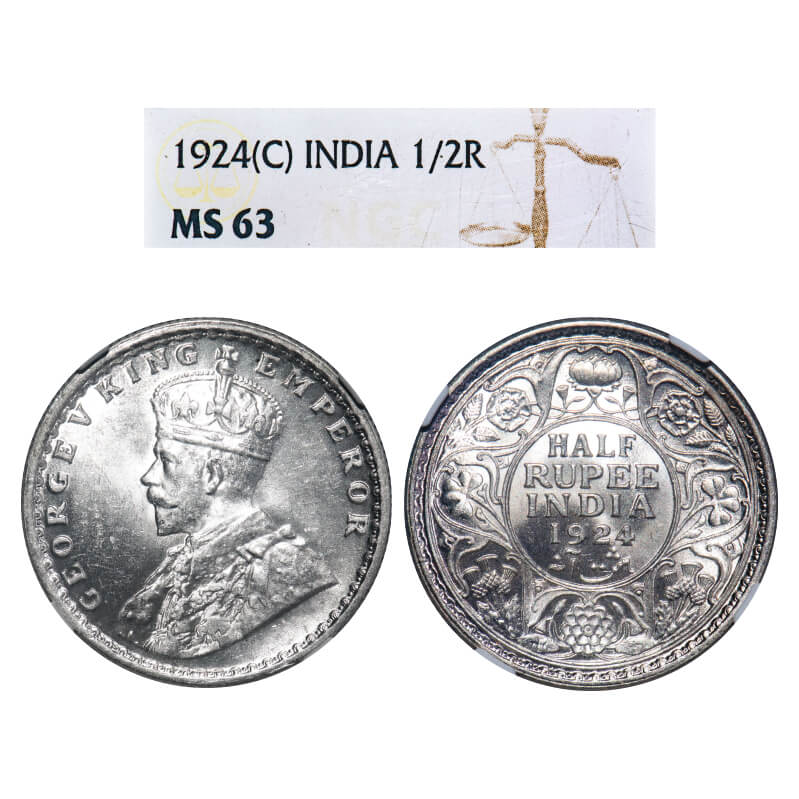 George V, Silver, Half Rupee, 1924, Calcutta Mint, No dot. F. Prid 327. GK 1063. NGC Slabbed MS 63. Extremely Rare.