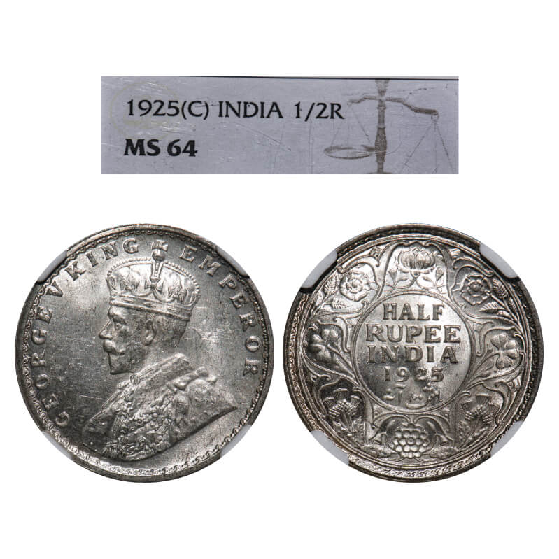 George V, Silver, Half Rupee, 1925, Calcutta Mint, No dot. F. Prid 328. GK 1065. NGC Slabbed MS 64. Very Rare.