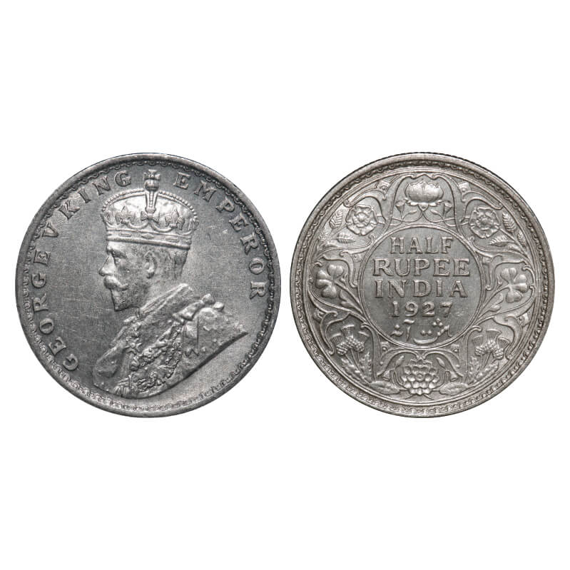 George V, Silver, Half Rupee, 1927, Calcutta Mint, No dot. F. Prid 330. GK 1069. Mint State. Rare....