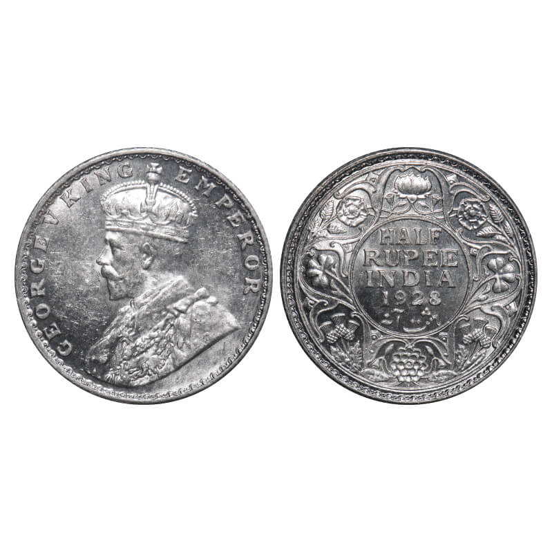 George V, Silver, Half Rupee, 1928, Bombay Mint, Dot. F. Prid 349. GK 1070. Mint State. Rare.